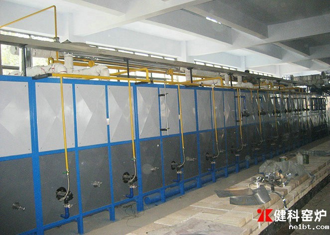 燃料燃烧系统:包括燃料输送管道、燃料预热、燃烧器等。隧道窑的加热燃烧主要是重油,轻柴油,和天然气煤气,原有的直燃煤方式已不多用。油类燃烧配备有储油罐和燃烧喷嘴。因油类成本较高使用较多的仍是天然气和煤气,天然气是通过天然气管道将天然气输送至窑炉有专门的天然气烧嘴进行喷射燃烧。煤气燃烧除了有专一的煤气管道输送至炉窑外,隧道窑用户大都自备有煤气发生炉进行煤气的生产,由煤气发生炉所产的煤气经过管道输送至隧道窑燃烧室,通过煤气烧嘴进行喷射燃烧。